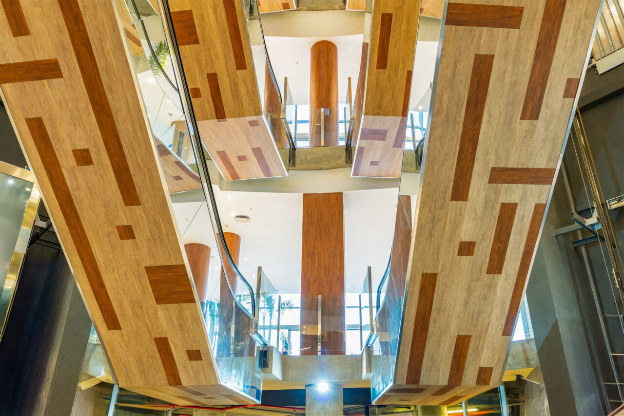 Modus Vivendi - Shopping Costanera - Teto Vinilico Origens Angelim e Tauari by Talt aplicados em composições de painéis sob as escadas - Encarnación, PY – Foto: Tokorre