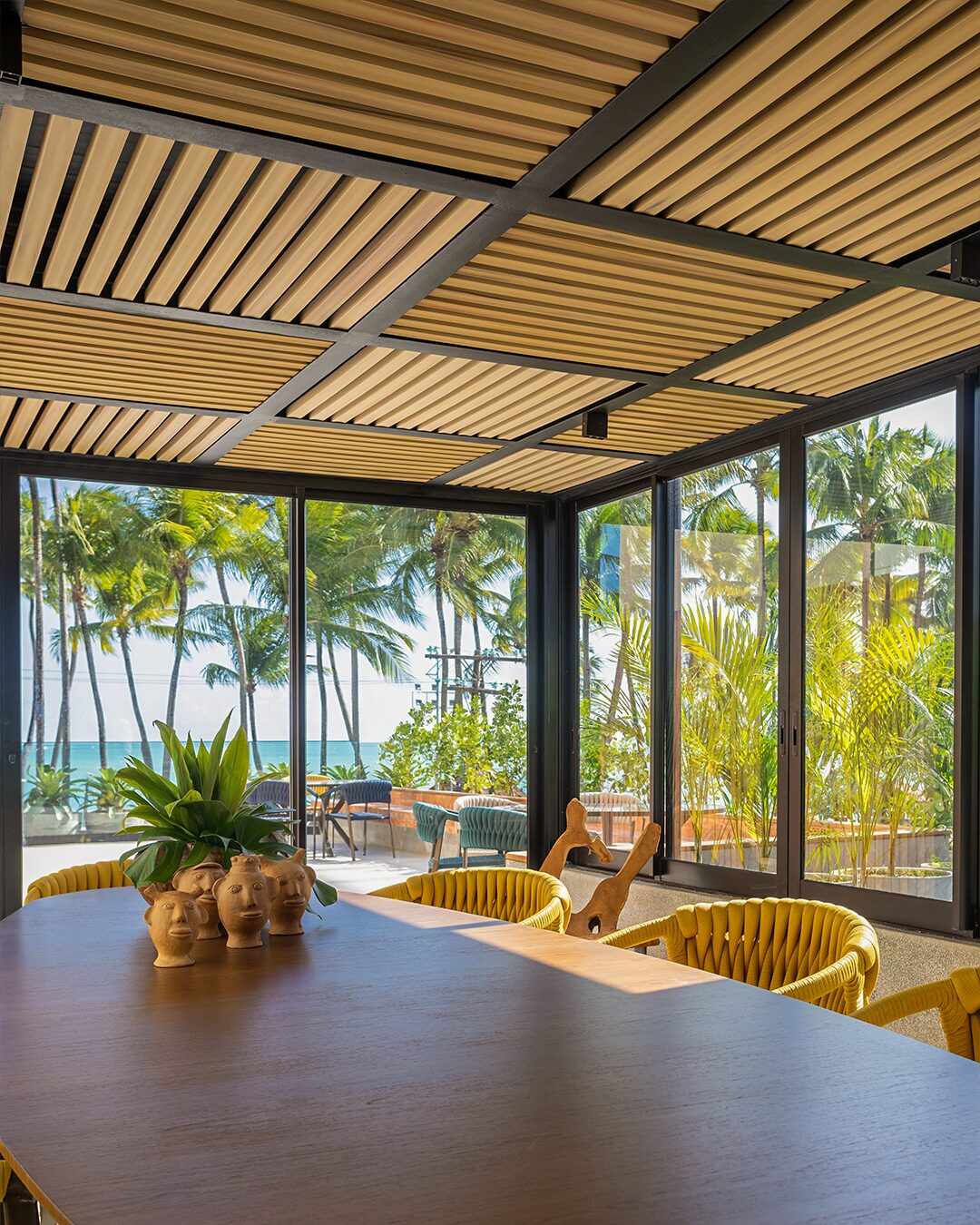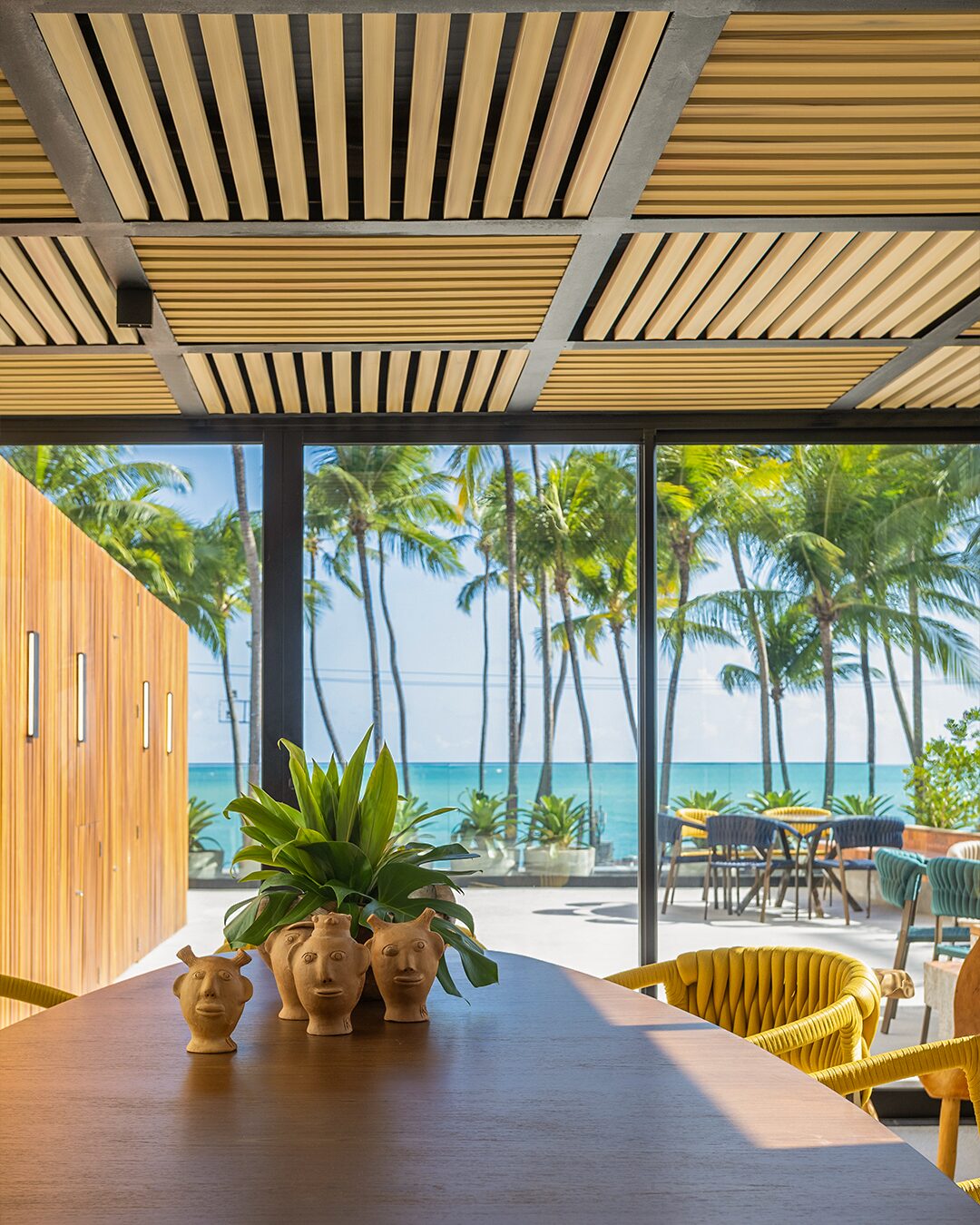 No rooftop praiano onde estreou, o Vini Brise Origens Tauari se integrou ao cenário como parte da paisagem: um elemento arquitetônico que respira junto com o ambiente, trazendo o frescor da madeira natural sem perder a praticidade do vinil.
