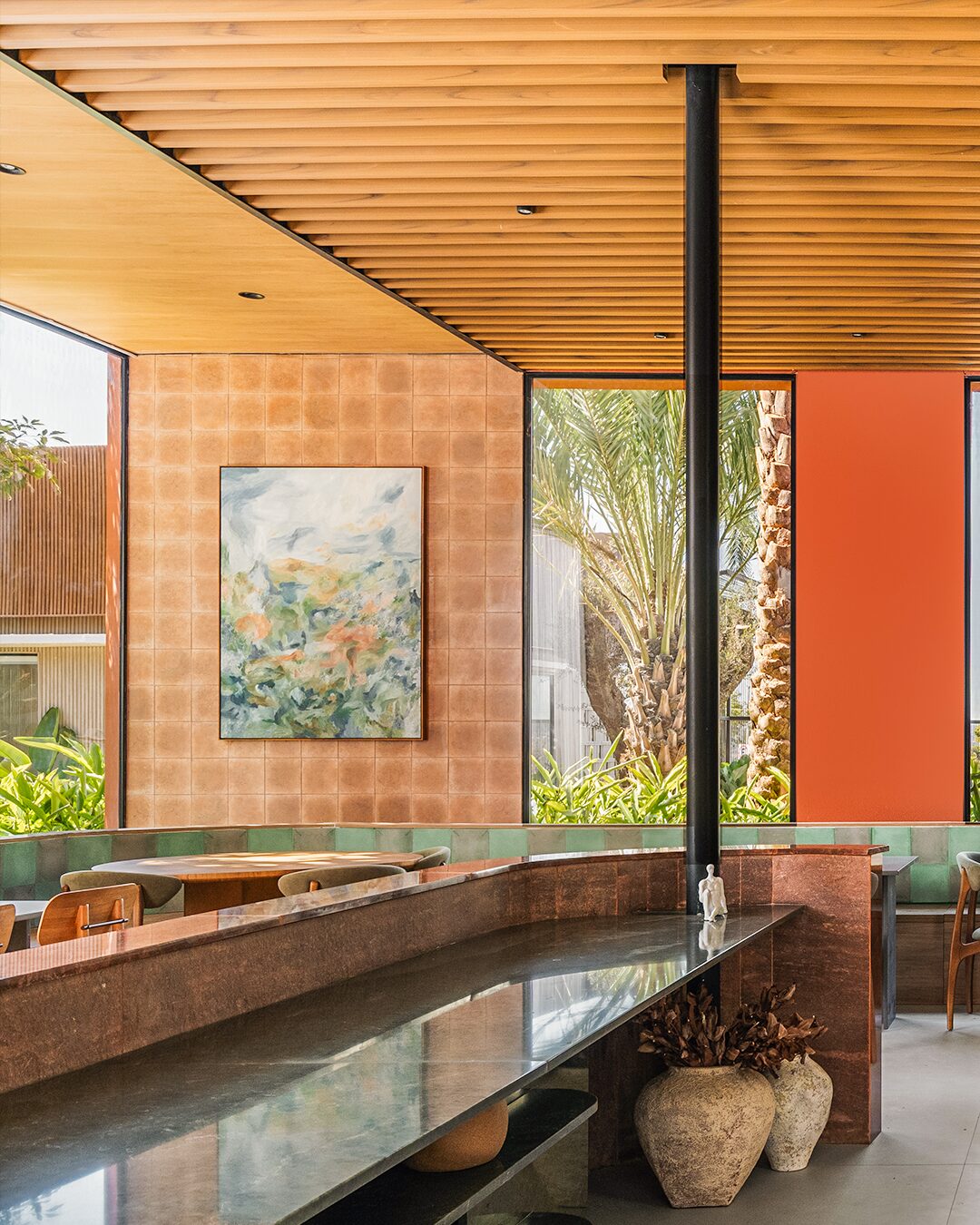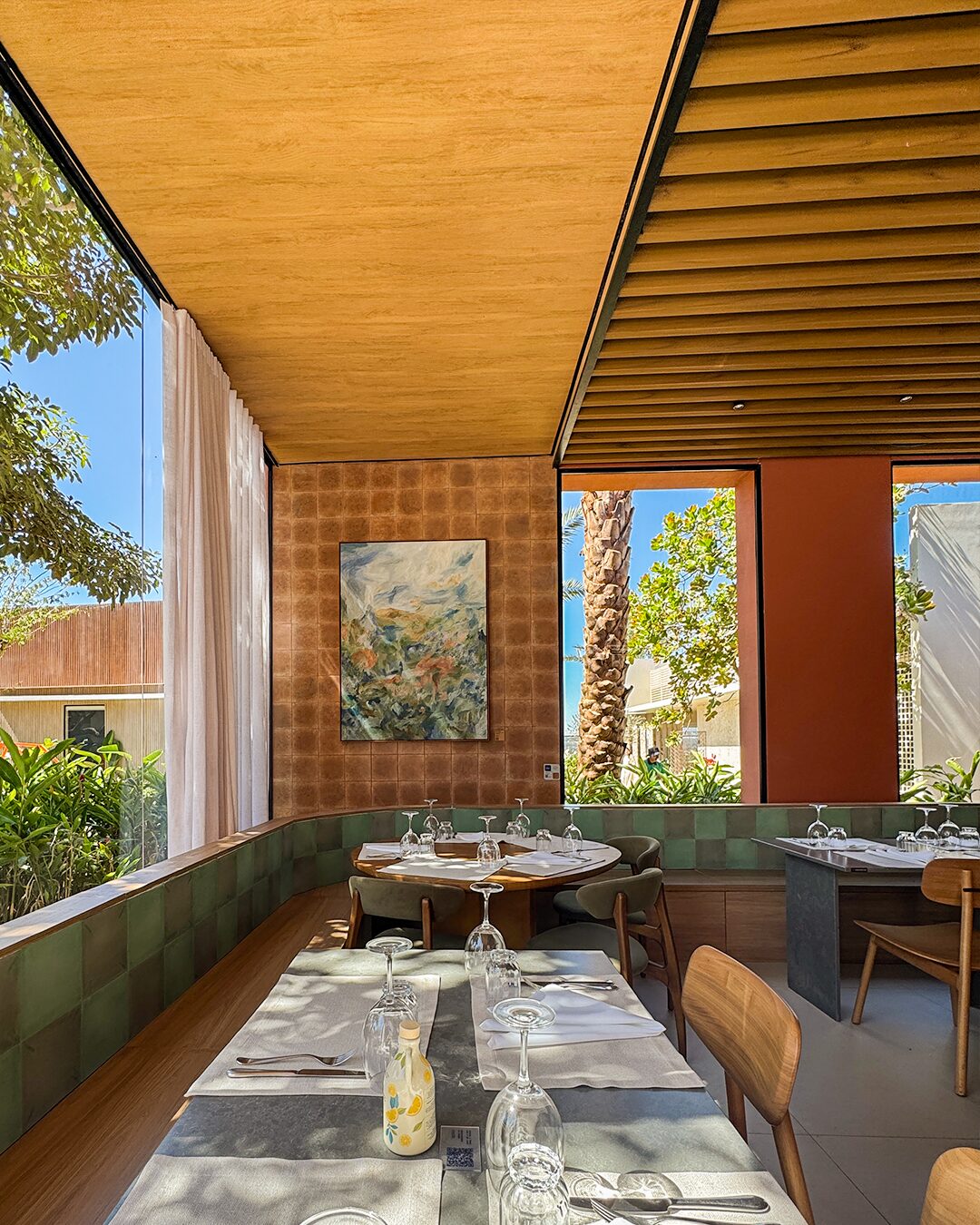 Outro projeto em que a composição linear traz o frescor arquitetônico é restaurante Cozze, onde possui janelas altas que ampliam a iluminação e trazem a sensação de ambiente externo. Aqui o Vini Brise Origens Mogno reforçou a versatilidade de aplicação e contribuição visual tanto para áreas internas quanto para externas.