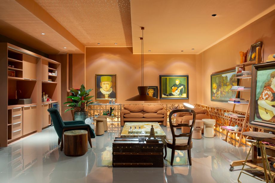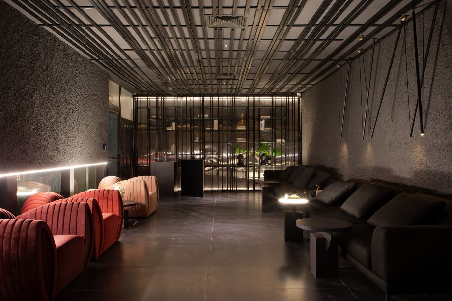 Para recepcionar os visitantes, buscando provocar a reafirmação de suas personalidades, valorização das memórias, ideias e histórias de vida, Filipo Madeira assinou a recepção com cores sóbrias e pontos de cores terrosas nas poltronas Shell do Estúdio Bola. A iluminação decorativa e os impactos visuais através de malhas em serralharia preta roubaram todos os olhares. “I am not minimalist”. | Fonte: Casa cor.