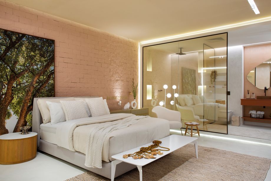Outra grande tendência observada, foi a utilização do mesmo acabamento nas paredes e teto, proporcionando mais unicidade e harmonia aos espaços. A textura Velvet da Coral, que possui um leve efeito metalizado, foi explorada de diversas formas. Acompanhe os registros a seguir.