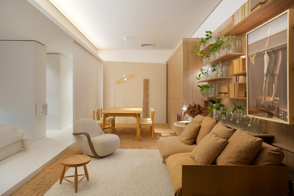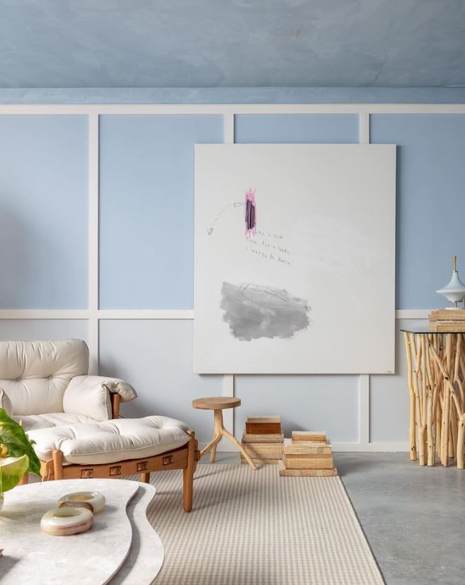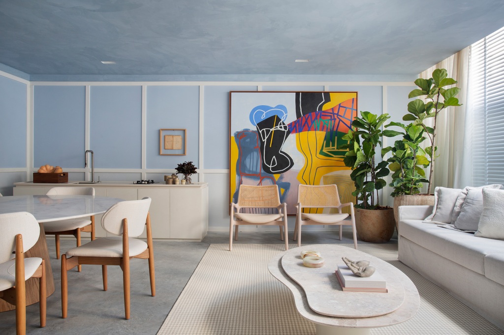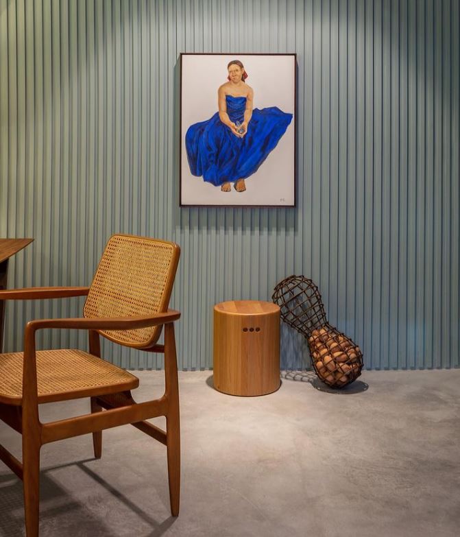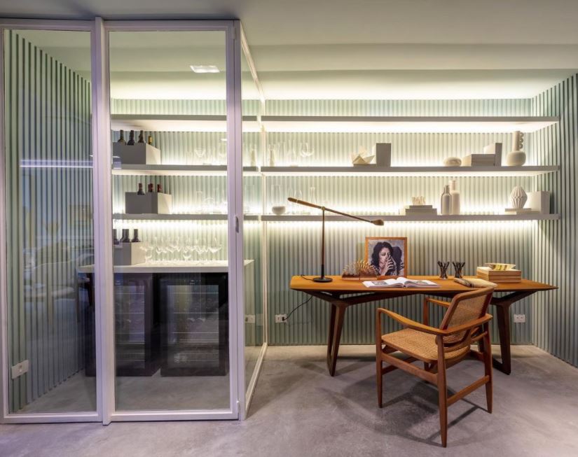 O grande destaque da mostra foi o ambiente ESTAR QUIES CORAL, projetado por Dubeux Vasconcelos Arquitetura. “Quies” significa quietude em latim, um ambiente multifuncional composto por hall, escritório, adega, lavabo, jantar, estar e apoio gourmet que nos permitiu mergulhar na calmaria dos verdes MINA DE CASCALHO + LAGOA NATURAL, e na imensidão e sutileza do azul MELODIA SUAVE (cor do ano da Coral) + OUTONO GELADO. Anota aí!