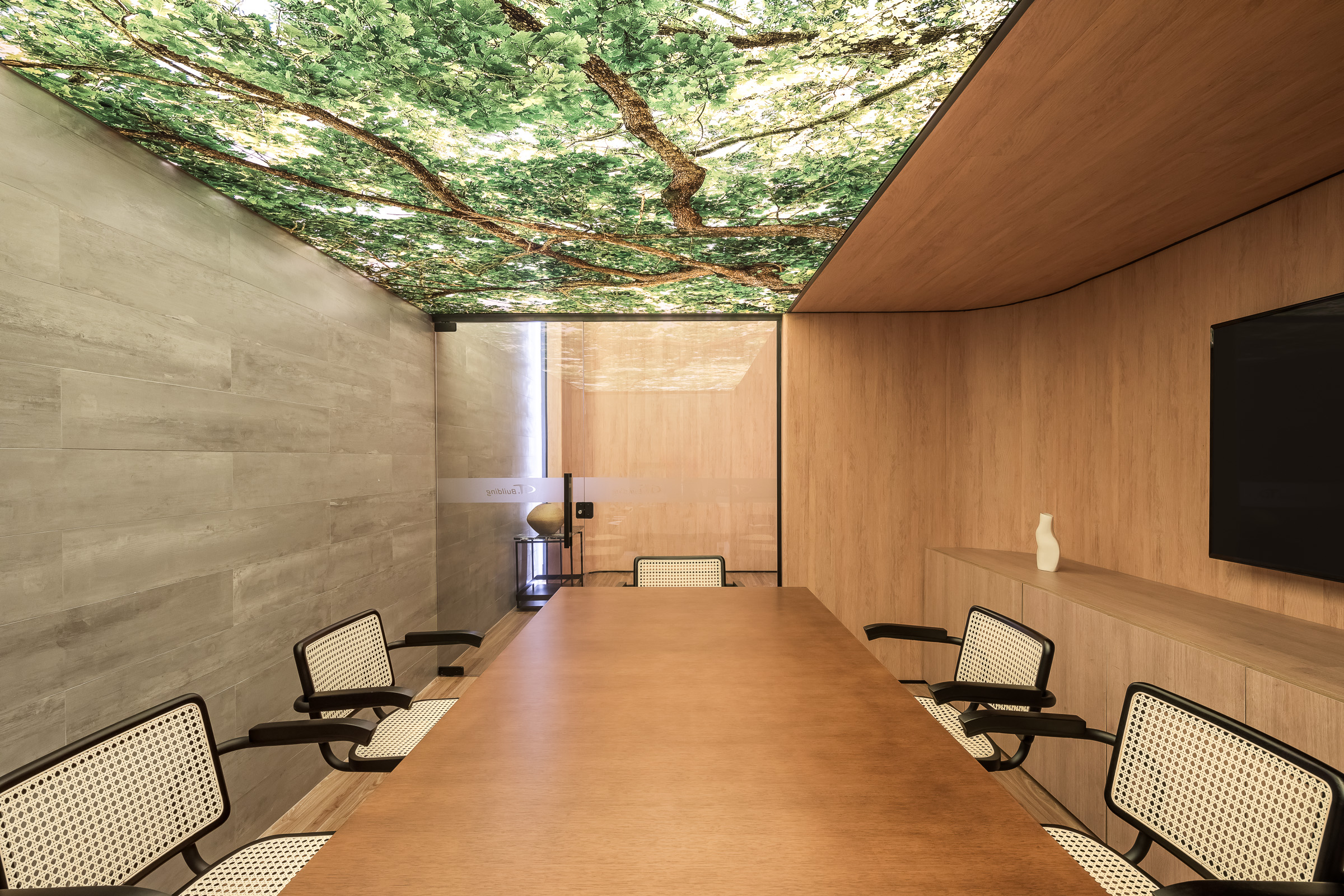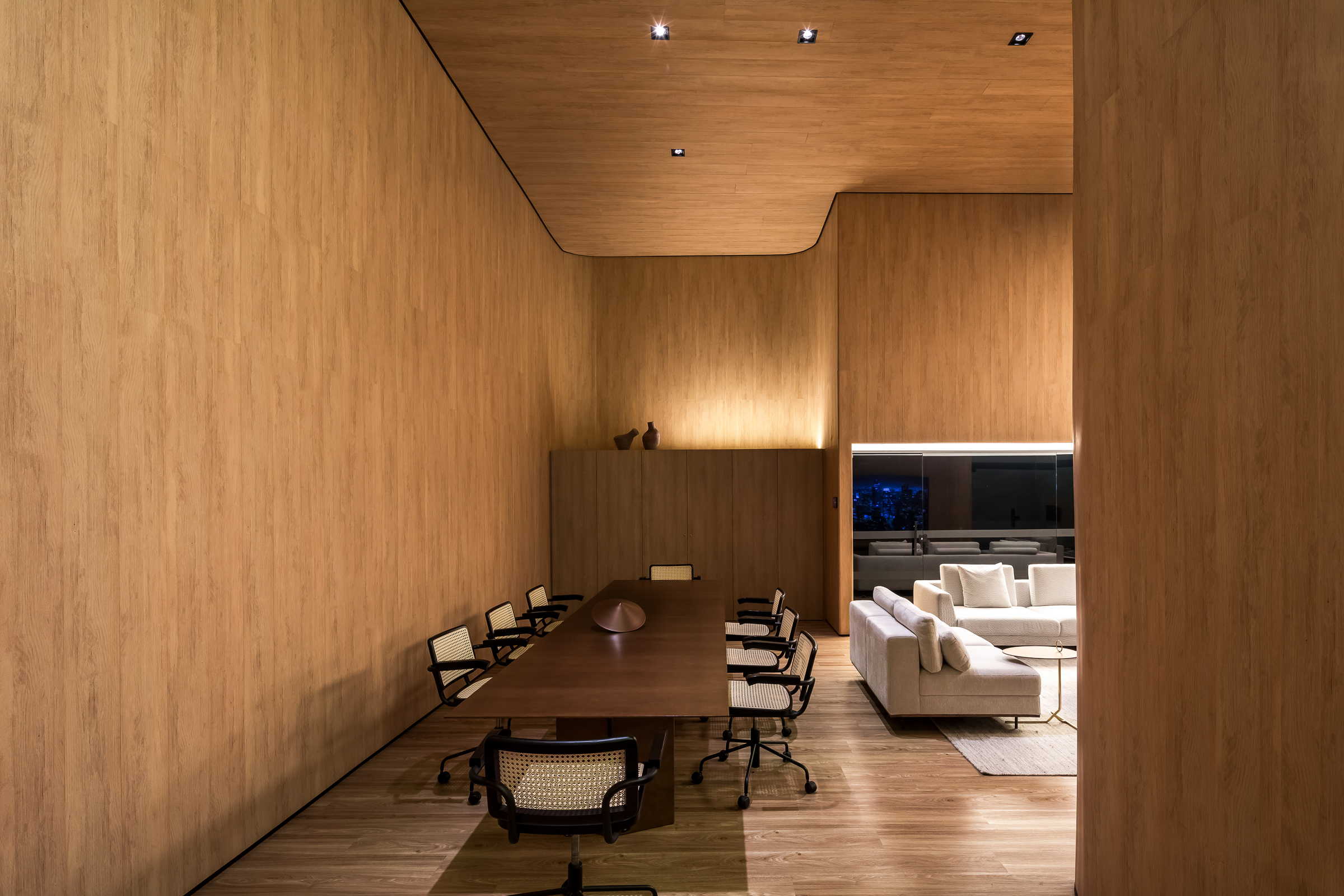 O Teto Vinílico trouxe uma estética amadeirada única, enriquecendo visualmente o espaço com tons distintos e texturas envolventes. A paleta de cores foi selecionada com precisão para se integrar perfeitamente ao design de interiores, criando uma atmosfera acolhedora e contemporânea.