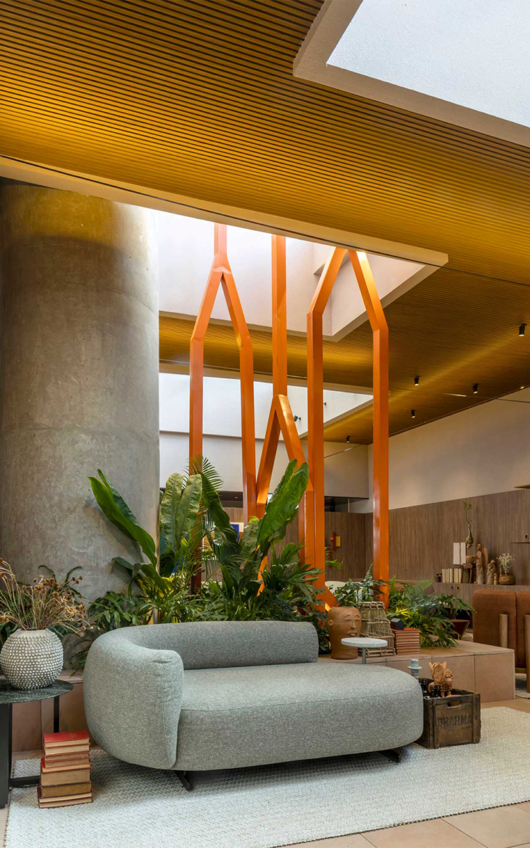 Marina Chaves e Victor Grimaldi reúnem no Espaço Feito à Mão, os referenciais do Cerrado para exposição e comercialização de obras assinadas por artistas e designers locais. Tons inspirados na vegetação e solo ampliam a experiência de elegância e conforto aos visitantes. Dentre os destaques do projeto, a sustentabilidade se faz presente em tecnologias e reaproveitamento de materiais na confecção de mobiliários. Com base nesta proposta, Teto+ Origens Okan reveste da área de exposição, com instalação que abraça teto e parede de forma contínua. As juntas imperceptíveis e a precisão da curvatura nas laterais colaboram na criação de uma estética fluida no projeto. O material, 100% reciclável, pode ser reinstalado em outros espaços sem comprometer a estética original.