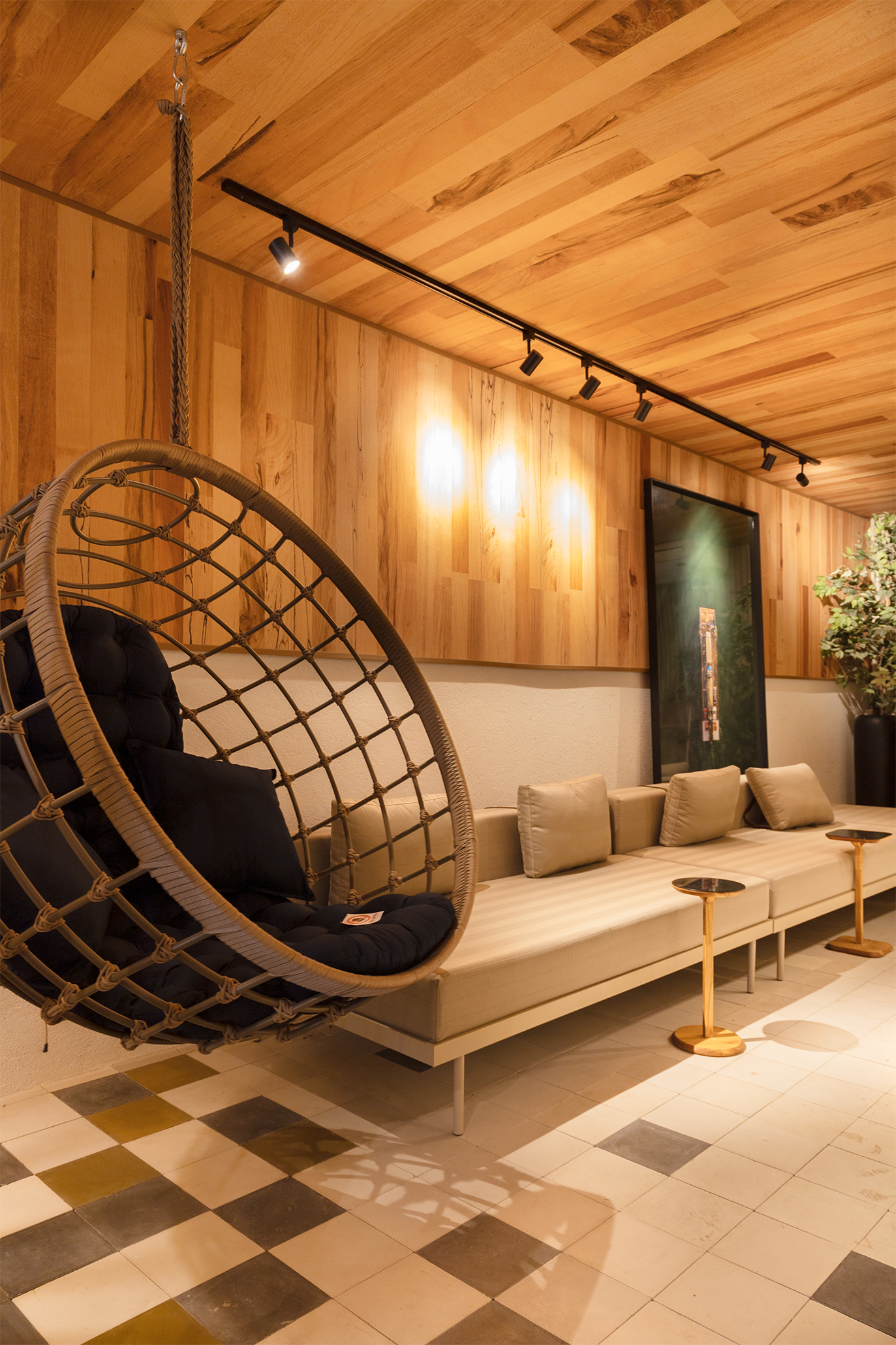 Cadeira suspensa e trilho eletrificado spot de LED.