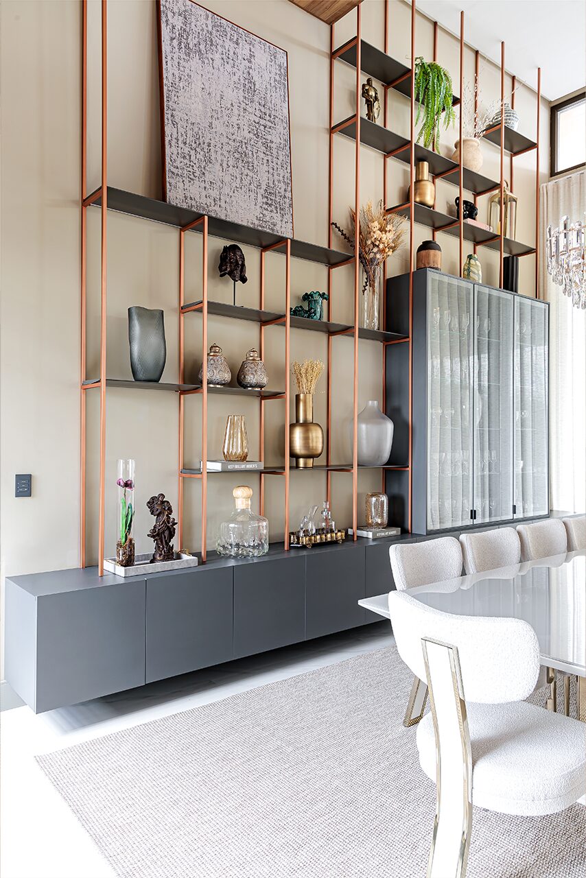 Outro destaque é a estante sob medida, desenhada para acompanhar a altura do pé-direito e abrigar louças da família, adornos e uma cristaleira iluminada. O ambiente também valoriza a espiritualidade dos moradores: uma porta de alumínio e vidro integra com leveza o oratório à área social da casa, criando um espaço de fé e contemplação.