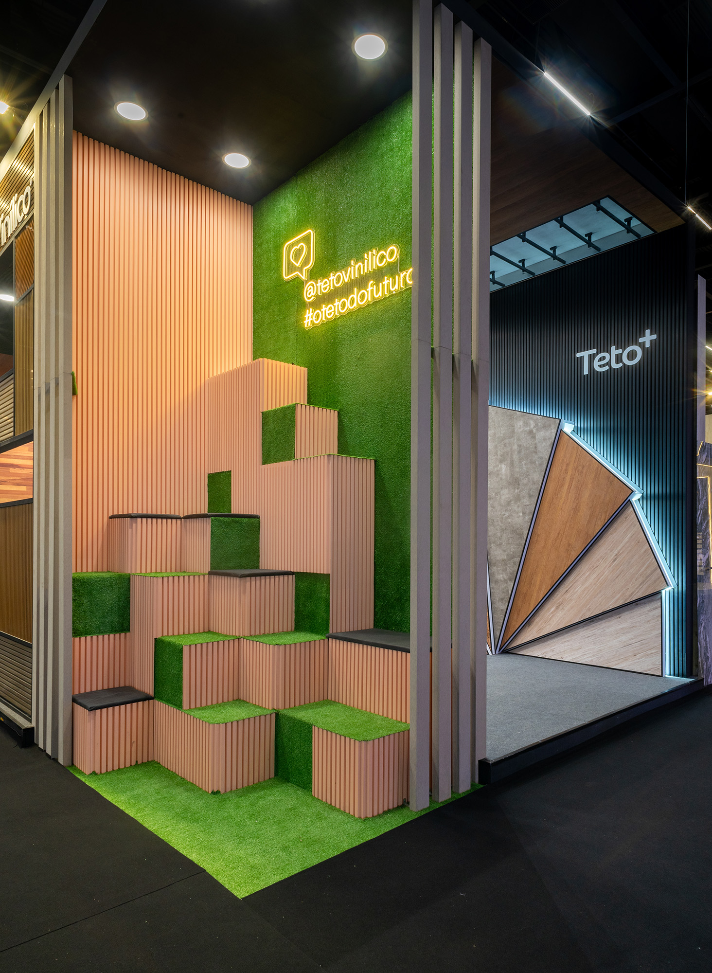 Quando a feira retornou em 2022, crescia o interesse por soluções que favorecessem integração de ambientes, continuidade visual e o uso de materiais com leitura mais natural, assim como a demanda por propostas que permitissem criar não apenas com o teto, mas também com a parede. Foi nesse contexto que surgiu a linha Teto+ (atual coleção Teto Vinílico+), ampliando a aplicação do vinílico para paredes. Mais resistente e versátil, o produto acompanhava uma tendência clara da arquitetura contemporânea: a construção de superfícies contínuas, capazes de conectar teto e parede com coerência estética e técnica. Era uma resposta direta ao modo como os projetos vinham sendo pensados naquele momento.