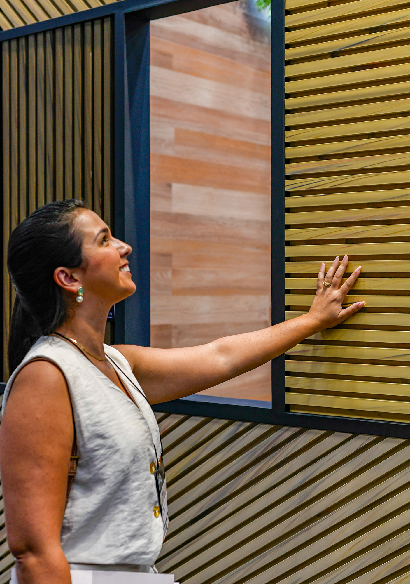 A edição de 2024 marcou um momento de maturidade. A Teto Vinílico passou a aprofundar a pesquisa sobre materiais, texturas e aplicações, explorando com mais consistência a relação entre teto e parede como um sistema integrado. Nesse processo, surgiram estudos e soluções em desenvolvimento voltadas à ampliação do portfólio, incluindo novas leituras para áreas externas, entre elas, as primeiras abordagens do Vini Brise.