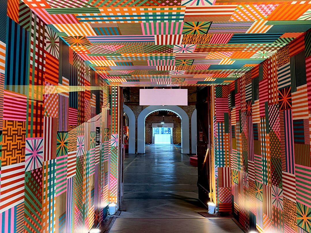 O percurso cultural continua dentro do galpão, onde a proposta ganha dimensão imersiva. Um corredor revestido com Teto Vinílico Traço+ no teto e nas paredes cria continuidade entre exterior e interior, enquanto uma plotagem com a estampa do produto na fachada reforça essa identidade visual desde o primeiro contato.